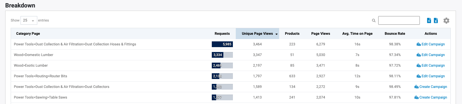 Tip: You can determine the ratio of how much your shoppers are clicking on pagination/filters on this category by comparing the Page Views column to the Requests column.