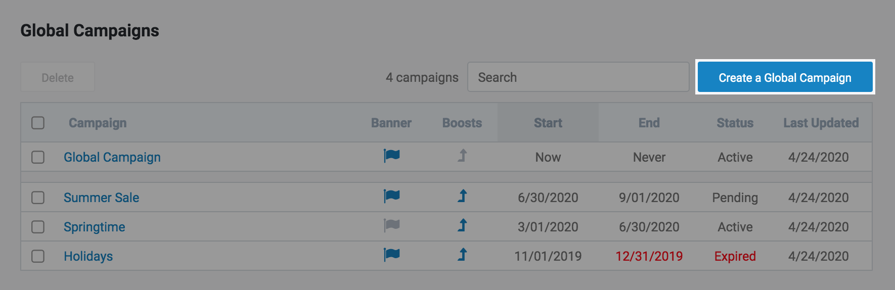 To delete delete any number of global campaigns at once, use the checkboxes to the left and then click the "Delete" button above the table.