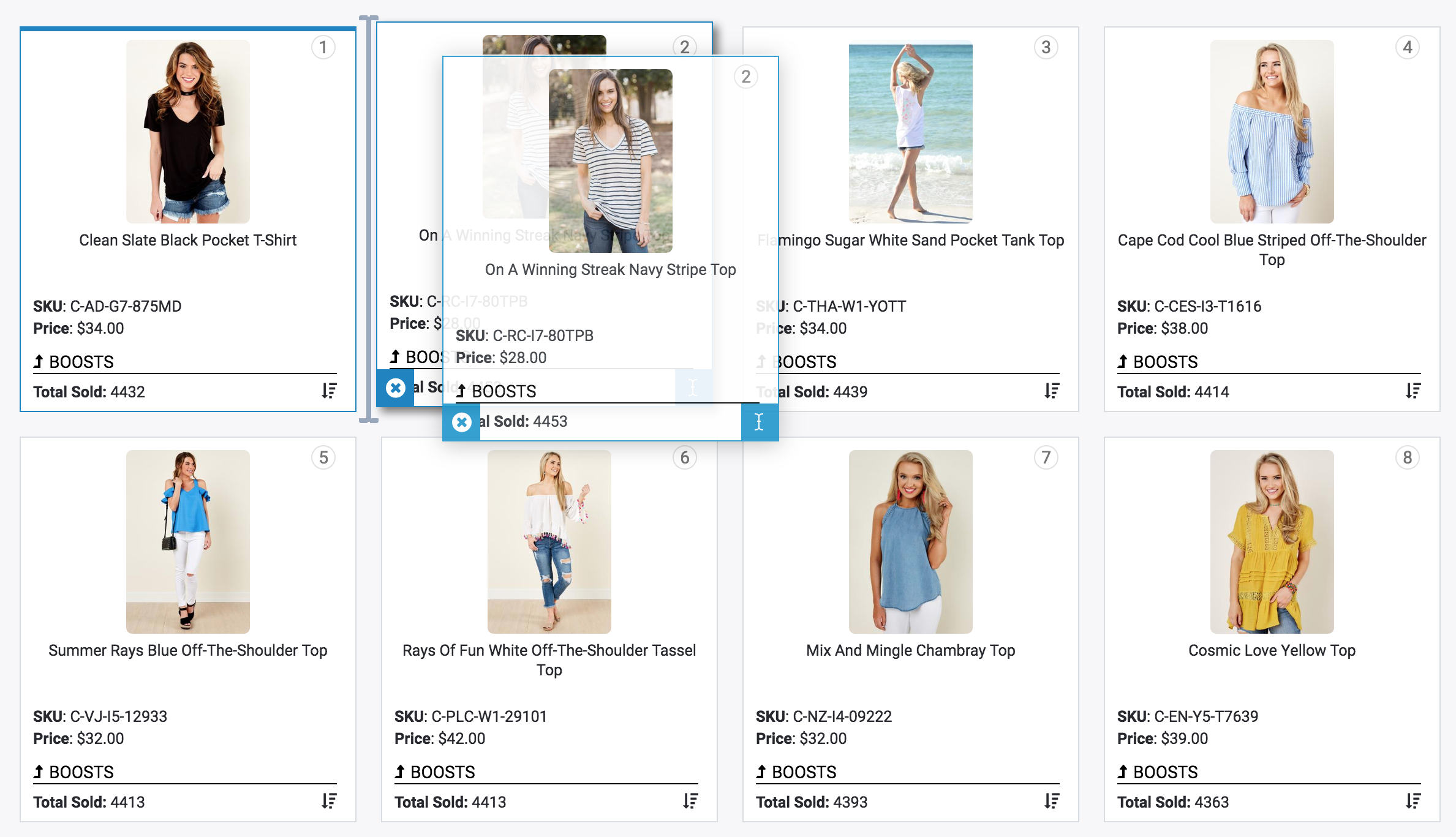 Product Boosting Rules are great is you want to affect a broad number of products with a few simple steps. However, you can also promote products individually to give you precise control of how your products appear on a search or category page. Inside Visual Merchandising, you can arrange specific products by drag and dropping them to your desired location.