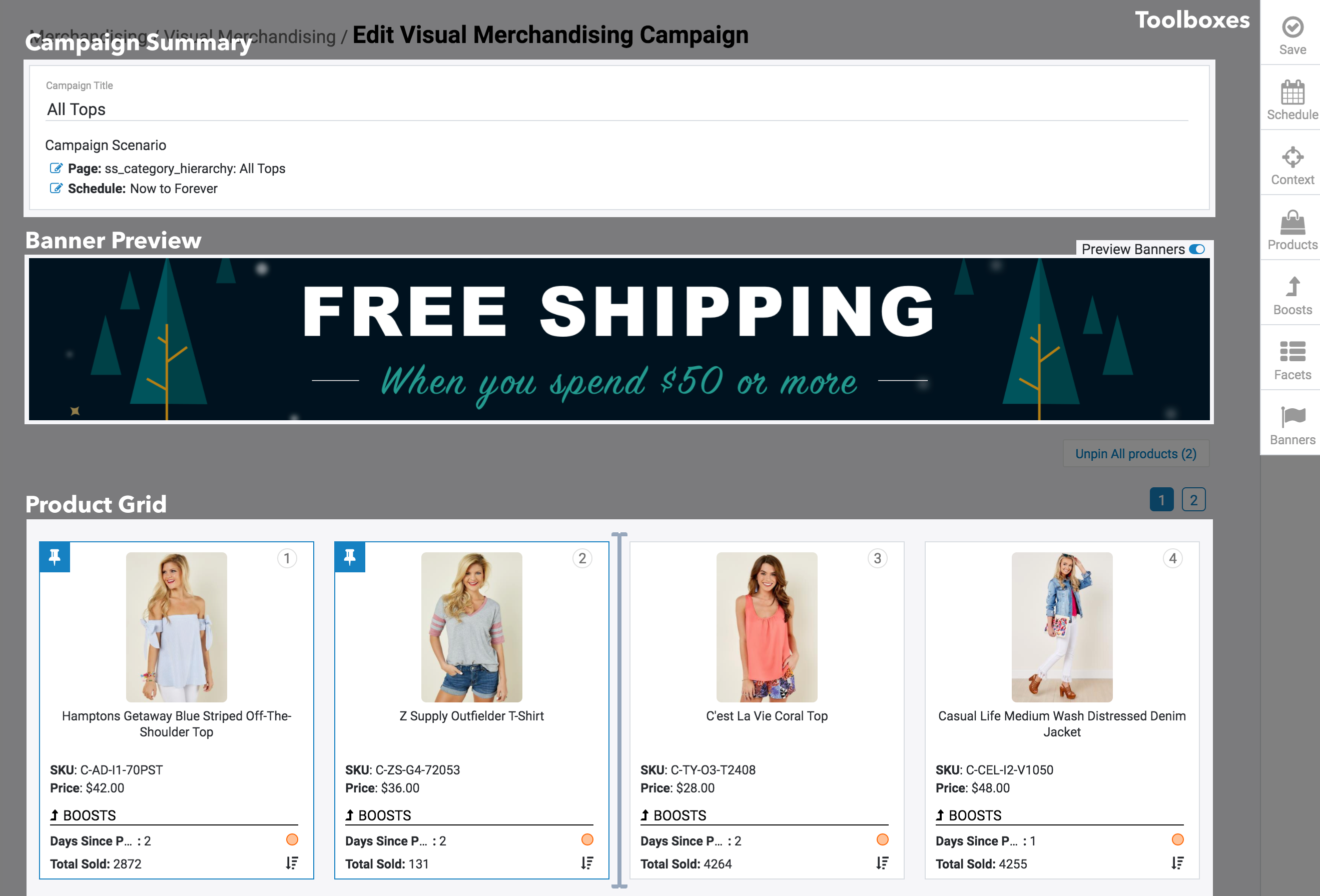 - The Product Grid shows you what your product listing will look like. It helps you manage pinned products, offers a cursor that allows more flexibility over promotion placement, and shows you how Boost Rules are affecting the ordering of products.