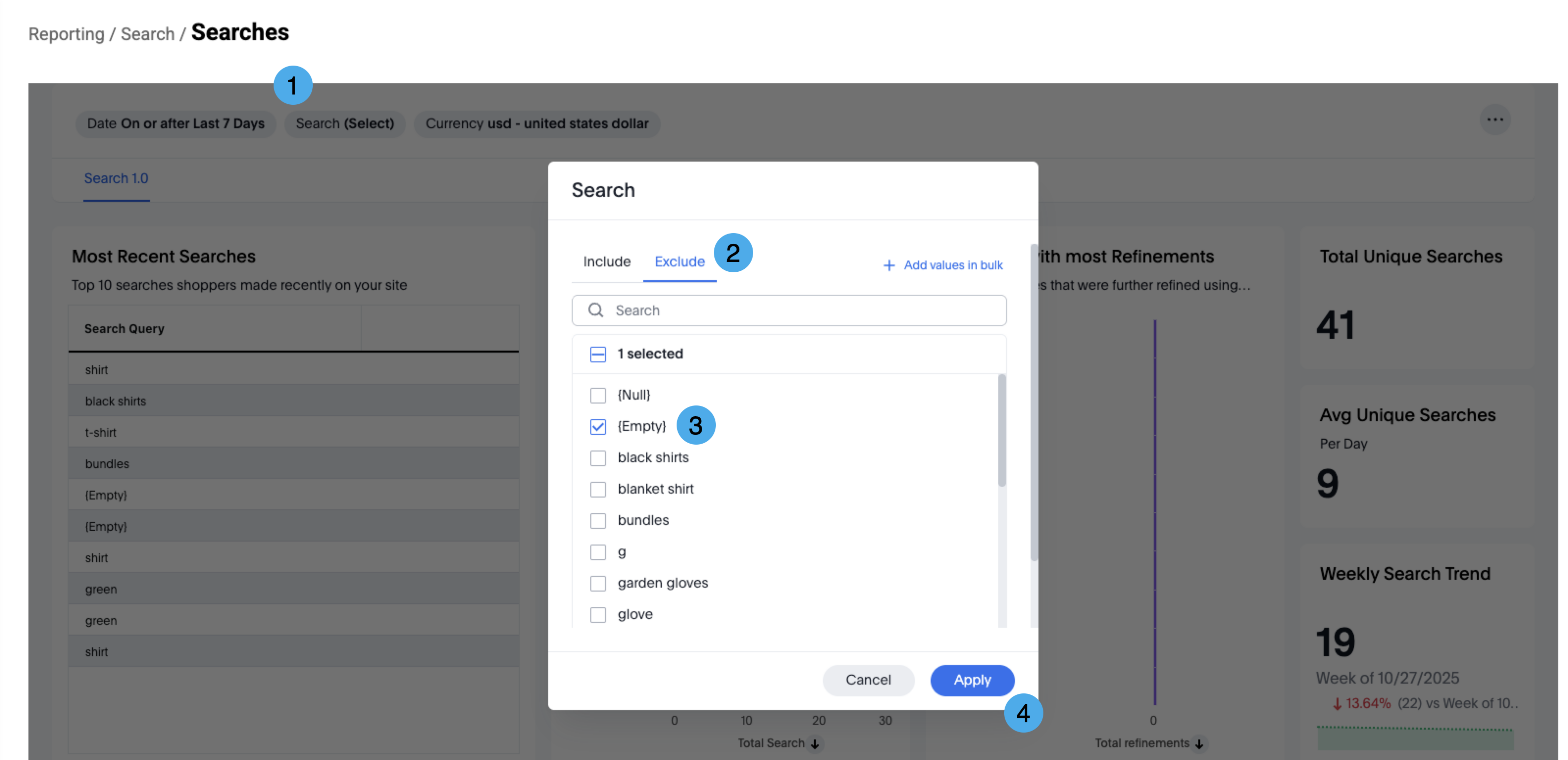 By default, we’re keeping these empty searches visible so you have full transparency into shopper activity. Seeing these can actually help you identify behavior patterns or technical setup opportunities. For example, if you’re seeing a lot of empty searches, it may mean your shoppers are unsure what to type or that your site allows blank search submissions. Your dev team can disable this if you prefer.