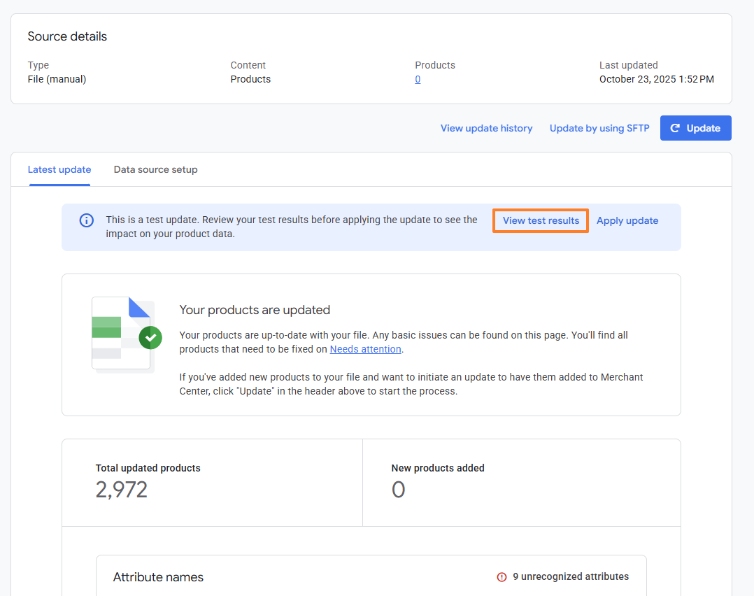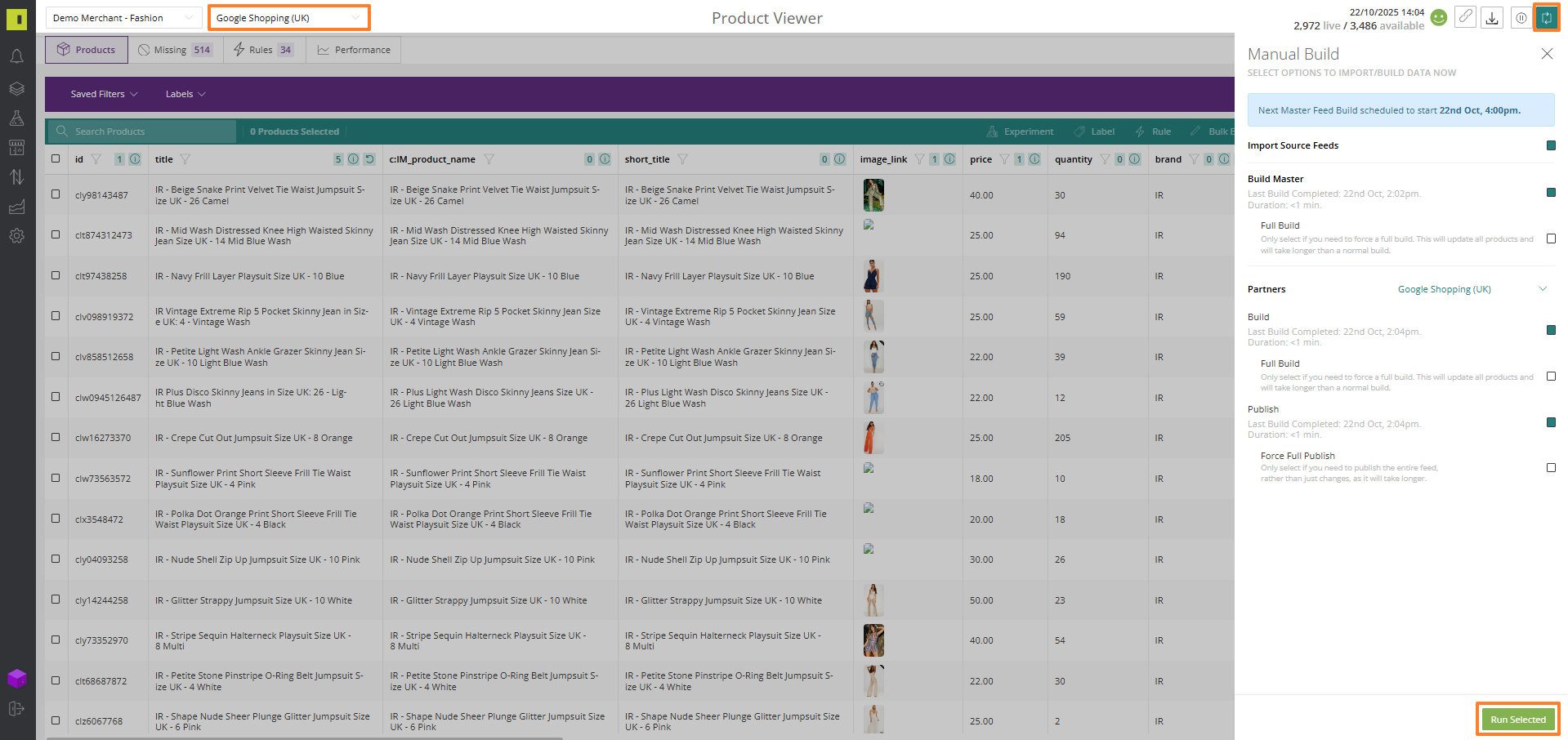 Before we can begin uploading a test feed into the Google Merchant Centre (GMC) it is important to refresh your product data to ensure that it is as up to date as possible. Navigate you your Google feed in the Product Viewer and Click 'Import Source & Build Master/Partner'