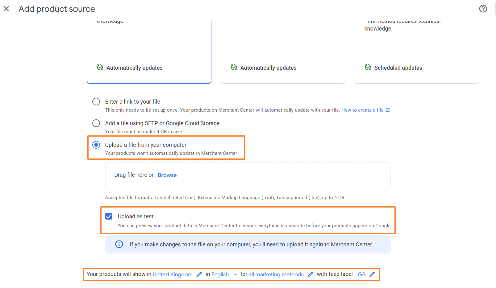 Next, you will need to select Upload a file from your computer, find the CSV file you just down loaded from the platform, make sure Upload as test is checked and that your Country, language, marketing methods and feed label are correct for the feed you are uploading. Then click Continue.