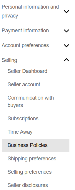 1. First you should go to your “My eBay” page on eBay, and navigate to 'Selling > Business Policies” in the bar on the left hand side: