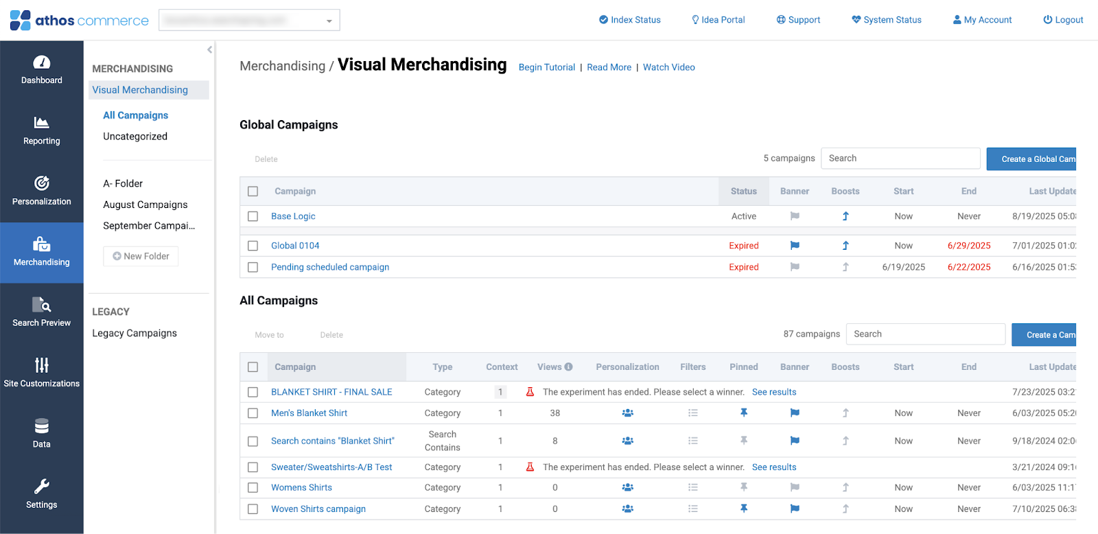 In the main Searchspring Management Console (SMC) menu, select "Merchandising". When the main Merchandising page appears, click "Visual Merchandising".