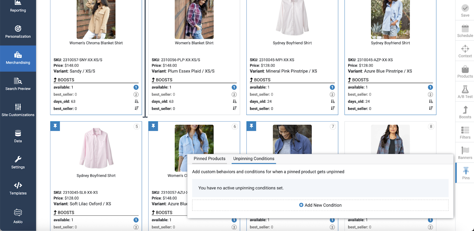 In the Unpinning Conditions tab, you can add up to two conditions (rules) that dictate when a product should be unpinned. This could be related to the product's age, inventory, season, or another factor. Automated unpinning rules ensure that outdated products are removed dynamically, keeping campaigns fresh and relevant without manual intervention.