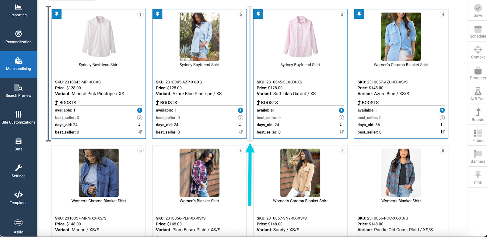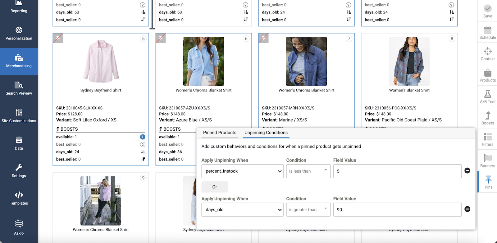 Use the "Unpinning Behavior" setting to control how products behave when an item is unpinned; "Shift Products" will shift all products (in the same order as their current positions) to fill the empty slot, while "Auto-fill Products" will fill the empty slot based on our relevance algorithm and boost rules.