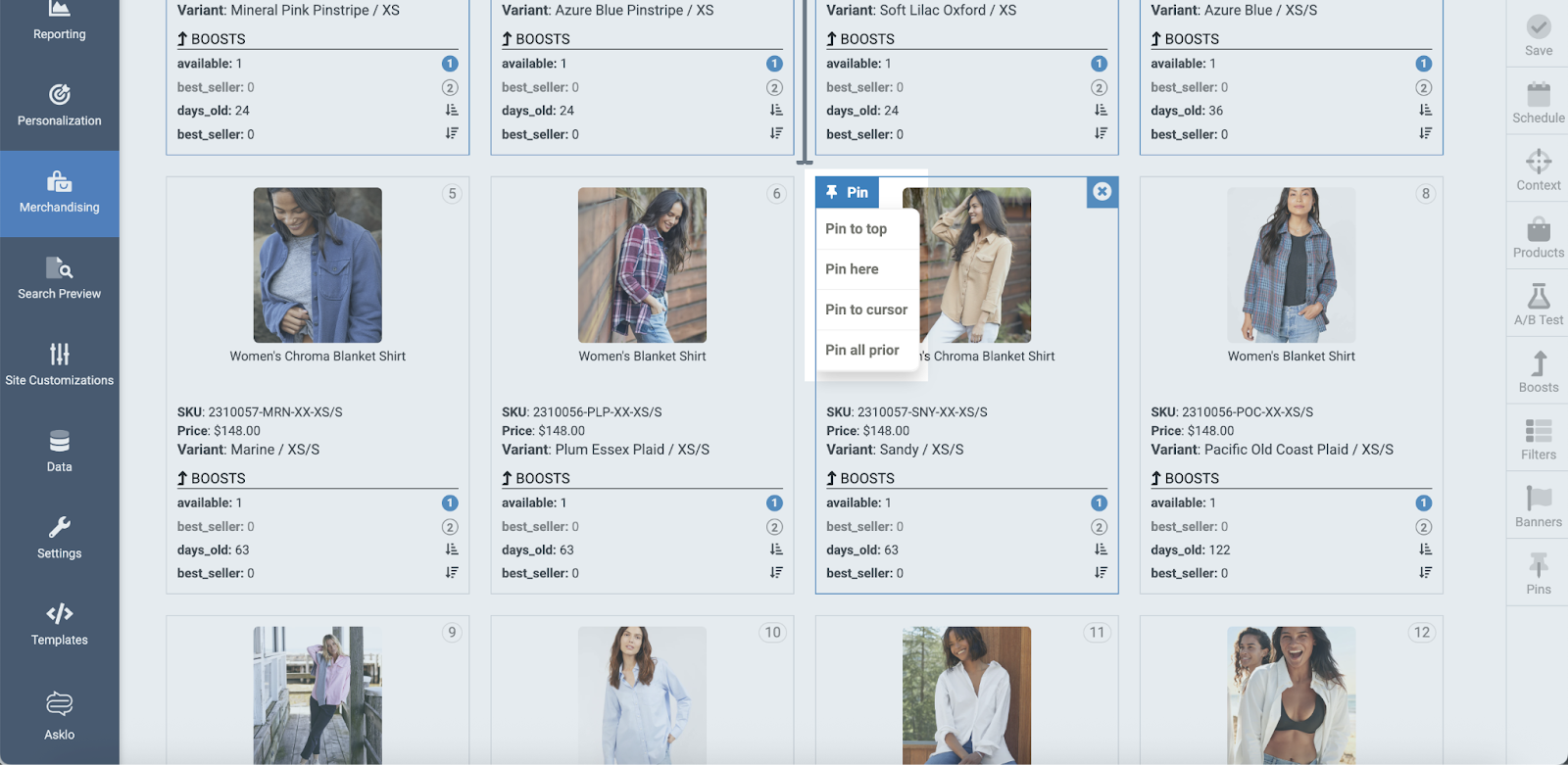 Click "Pin to top" to pin the selected item in the very first slot (position) on the page. The cursor will move immediately from the first slot to the right of the pink shirt.