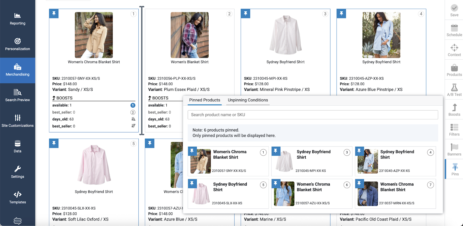 In the Pinned Products tab, you can preview all items that have been pinned, along with the slot (position) of each product, which is represented by a circled number in the top right corner of each product. Mouse over the pin on an item and click to unpin it.