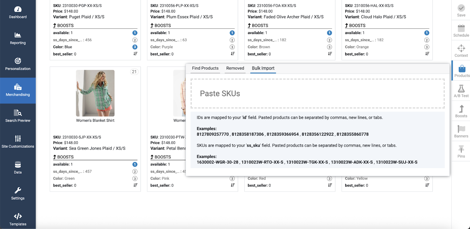Click the Bulk Import tab to add multiple SKUs at once. Values should be comma-separated and can be the "unique ID" or the "SKU" fields specified in Core Mappings settings in Data\Data Settings\Core Mappings.