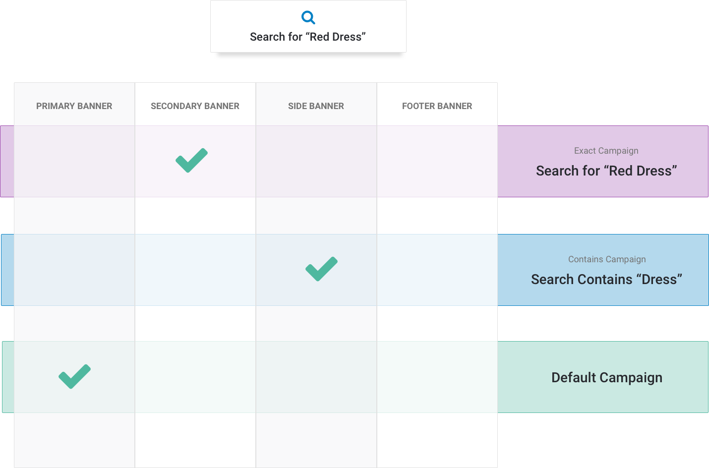 - If a shopper searches for "red dress" they will only see the 1 banner from the exact campaign.