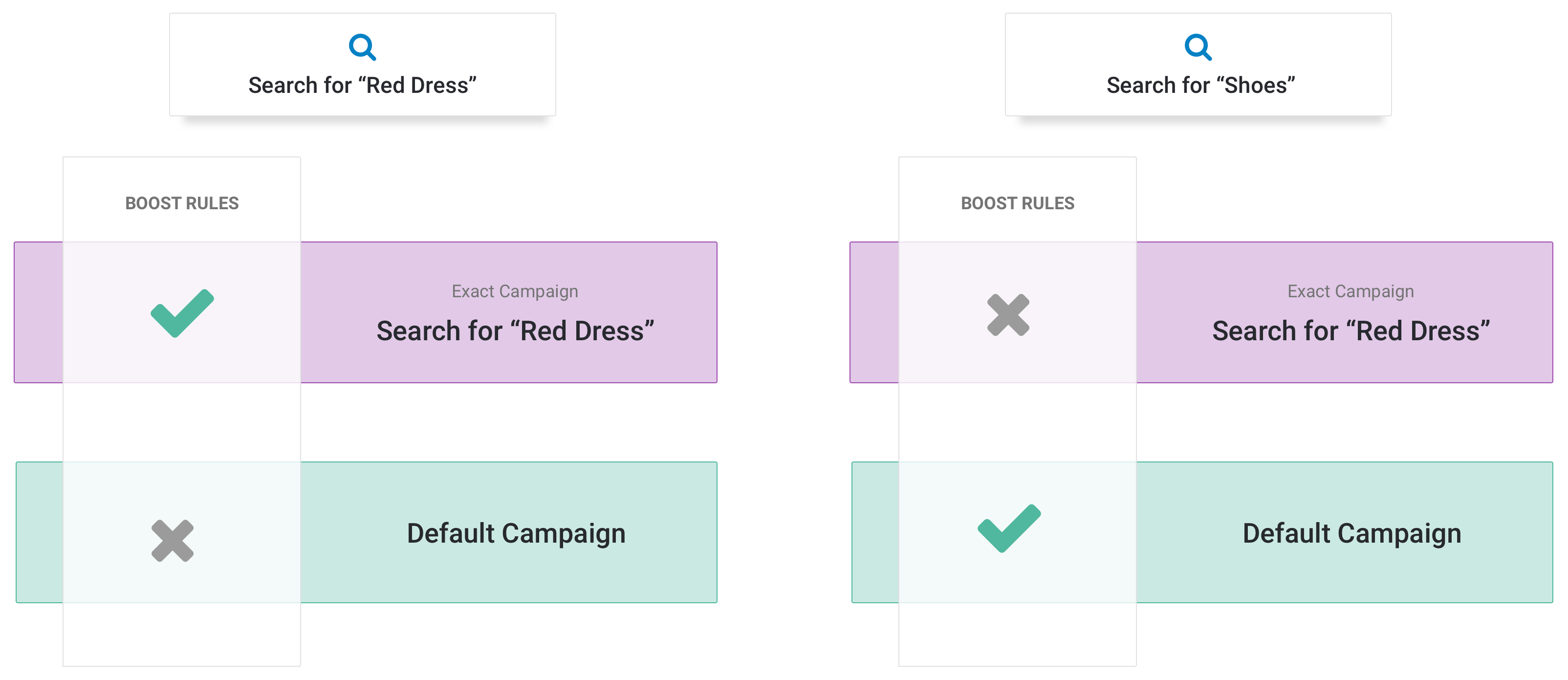 - When a shopper searches for "dress", the 1 boost rule from the exact campaign will take affect.