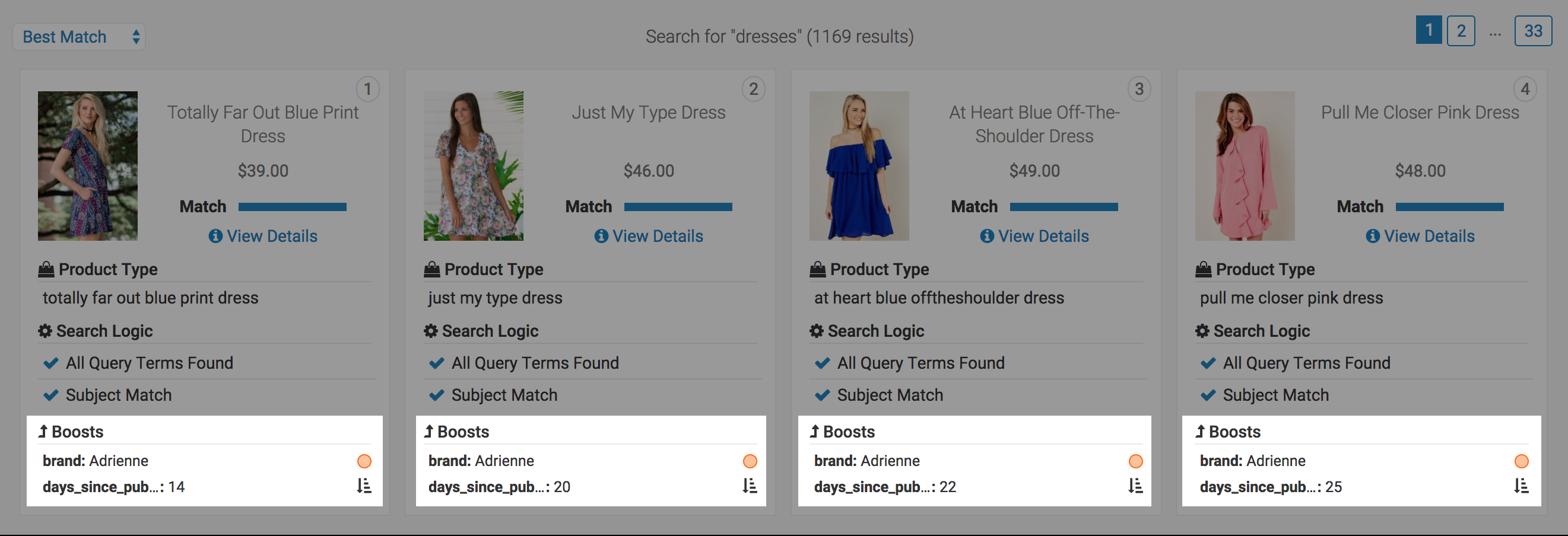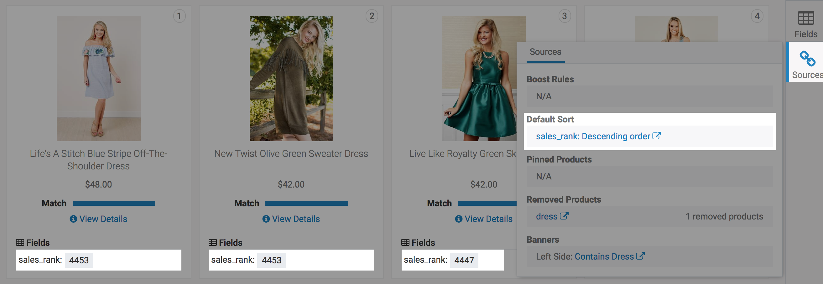 You can see this in Search Preview by looking at Boosts on each product. Groupings and sub-sorts can both occur here, as illustrated by the dots and sort icons, respectively. Boosts higher in the list are more important, and a boost showing lower is always a tie-breaker for the rule above it. You can also view the boost rules and where they come from in the Sources toolbox.