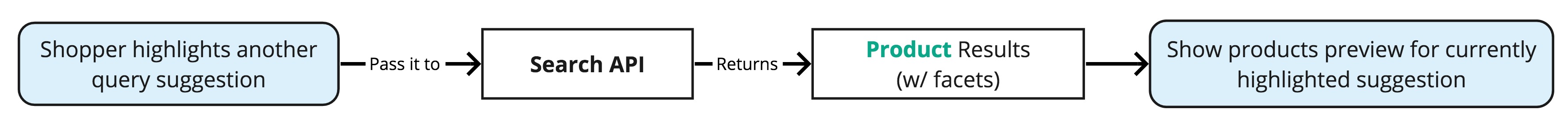 When a shopper highlights a different query suggestion from the list, simply hit the Search API again to show product results for the new query.