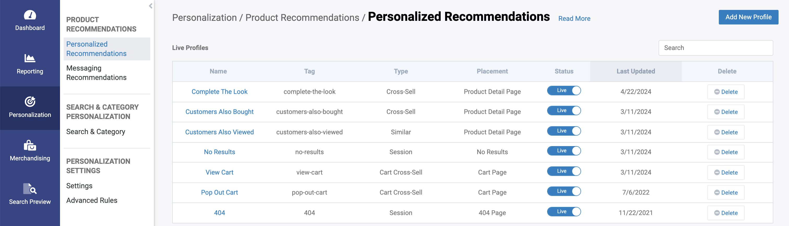 The main page for Personalized Recommendations gives you a high-level view of which profiles you have set up, and the status of each one.