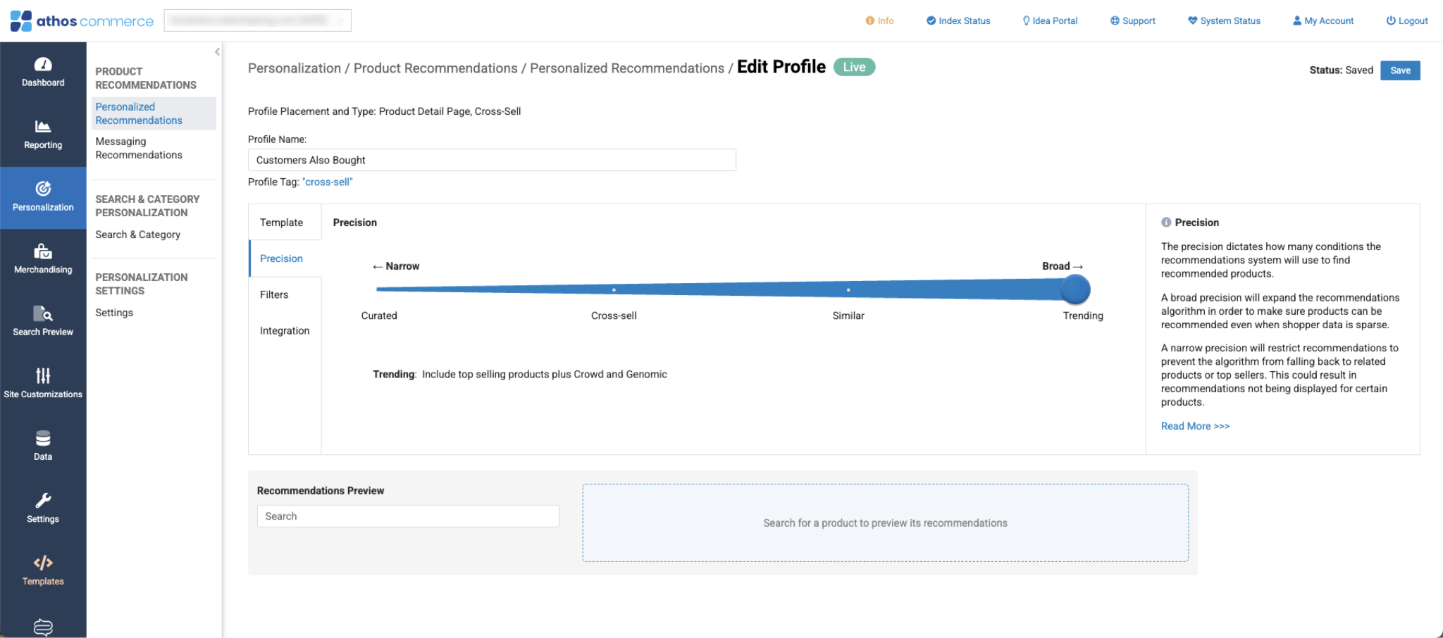 The options for this setting range from Narrow to Broad. A broader precision allows recommendations to “fall back” in situations where data is insufficient so that some alternative form of recommendations can be presented to the shopper. A narrower precision restricts the profile so that recommendations only show if they meet the criteria for the selected type. The narrower setting may result in the profile not showing on certain pages when the minimum threshold of products has not been met.