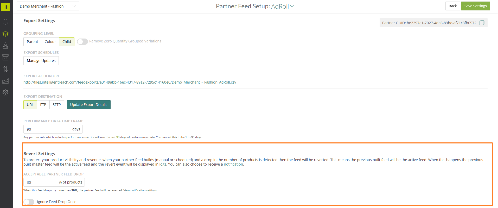 You will then have a Reverts Setting options where you can set the threshold for that partner feed or ignore the product drop as needed: