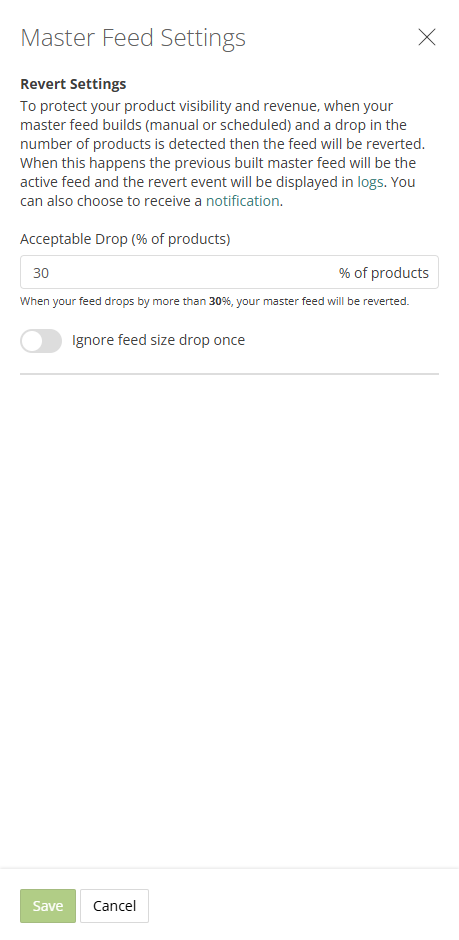 If the product drop exceeds the set threshold, the feed will automatically revert to the last stable version.