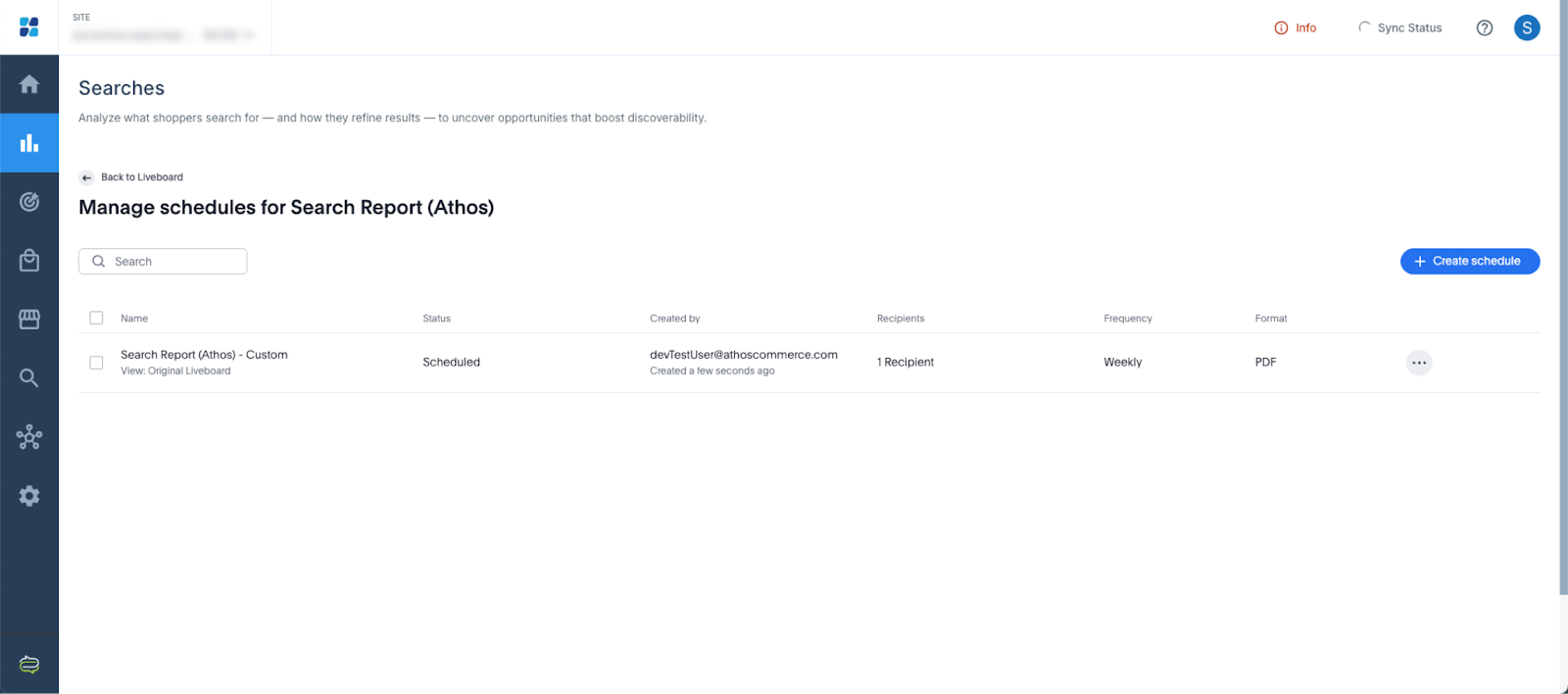 If you choose "Manage Schedules" from the report options, the system will open a new window that displays any schedules for the selected report. You can add another schedule for this report by clicking the "+ Create schedule" button at the top right of the page.
