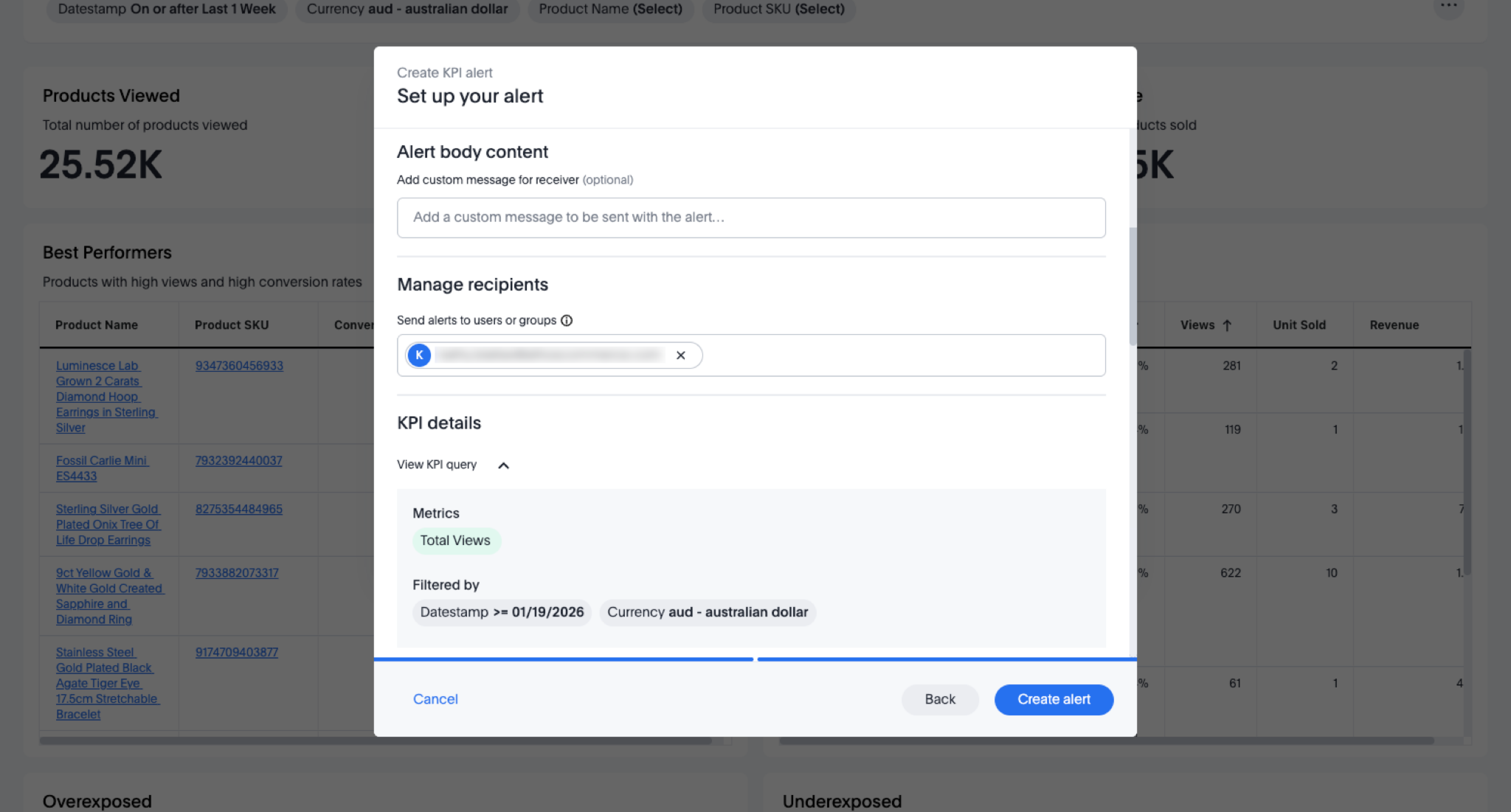 When your customizations are complete, click the "Create alert" button at the bottom right to save the KPI alert, or click the "Back" button to update your customizations. Click the "Cancel" button at the bottom left to exit this screen and return to the main report page.