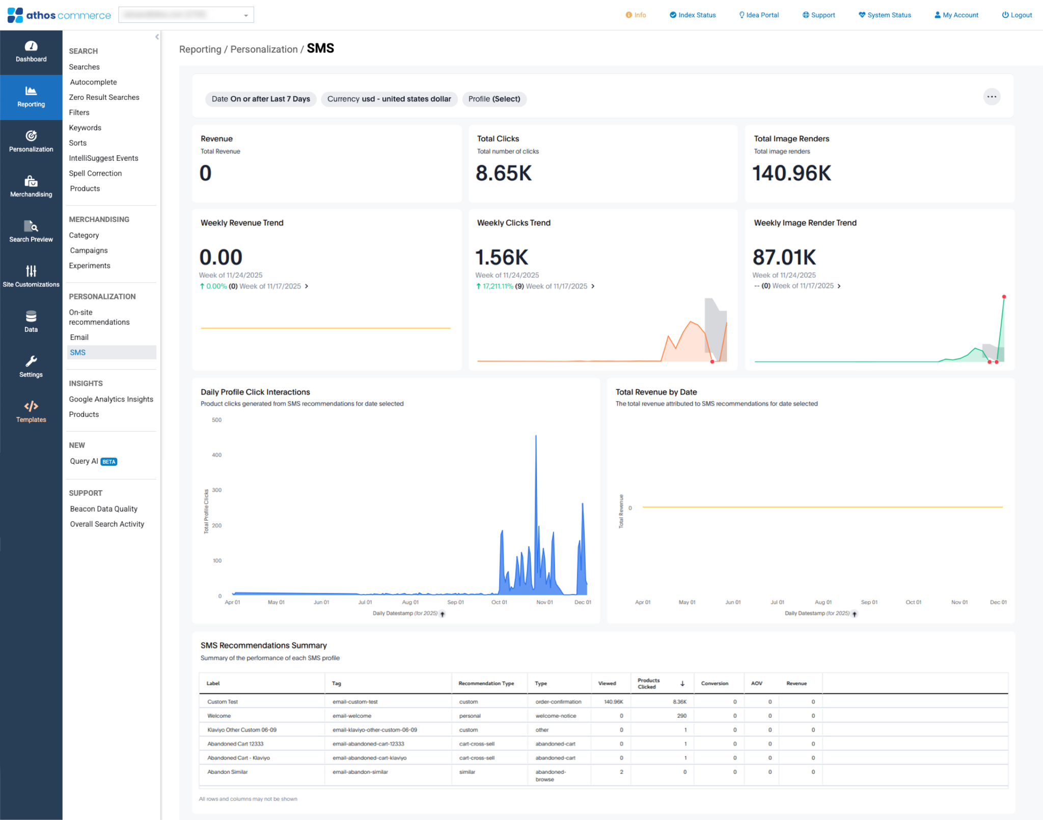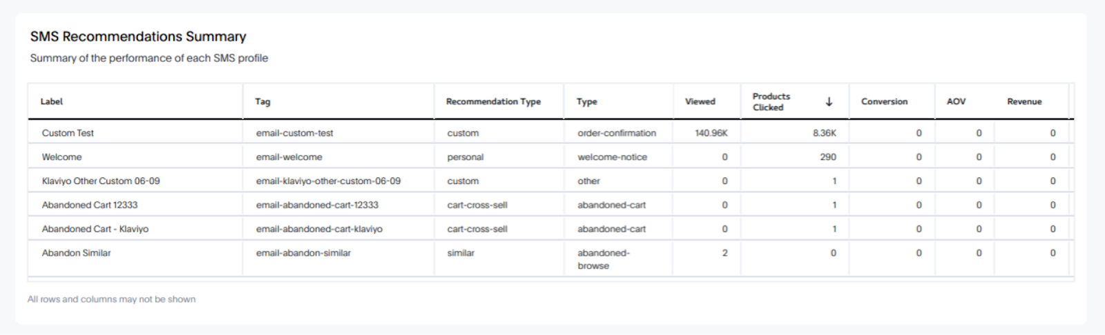 Use this report to understand how well your SMS-driven product recommendations are performing and to identify areas to optimize for engagement or revenue.