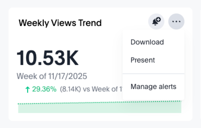 Within any visualization on the report, click the kebab menu (three dots) at the top right. Select "Download" to choose between an .xlsx or .csv export, or choose "Present" to view the visualization in full-screen mode.