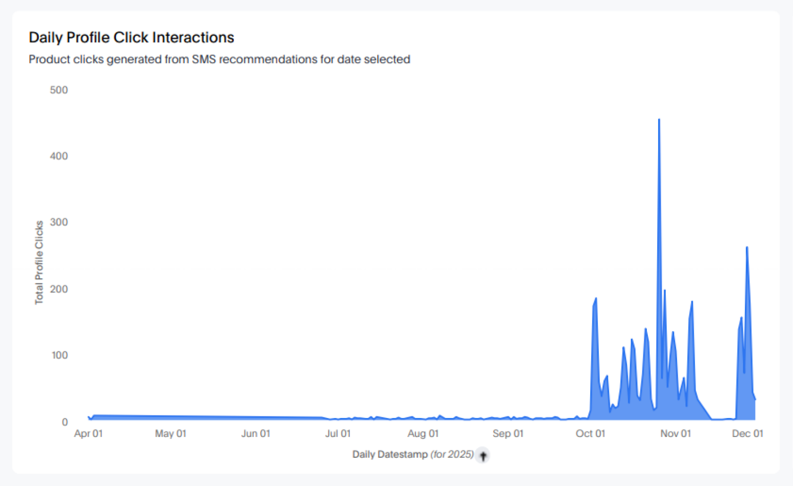 This chart shows the product clicks generated by SMS recommendations for the selected date range.